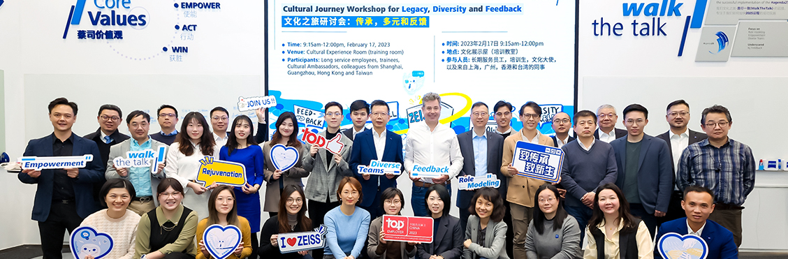 蔡司集团从2008年开始了文化之旅的征程,希望通过文化的建设,让员工能获得更好的行为引导,创造健康的工作环境并进一步支持业务目标的稳定达成。现阶段的文化之旅口号是WalkTheTalk-言行一致,倡导大家将口头的承诺落实到行动中,在工作中积极践行反馈-Feedback,榜样-Role Modeling,赋权-Empowerment与多元团队-Diverse Teams。